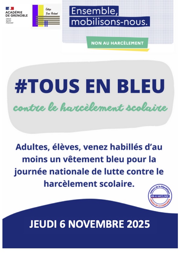 Le jeudi 6 novembre 2025, l’ensemble de la communauté éducative (élèves, personnels, parents) du Collège Jean Rostand de Moûtiers se mobilise dans le cadre de la Journée nationale de lutte contre le harcèlement scolaire.